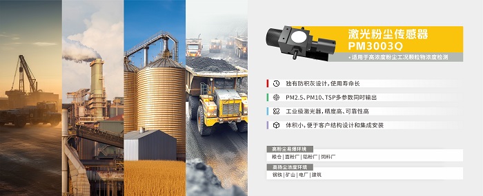 導(dǎo)致糧食粉塵爆炸的因素有粒徑、濃度、點燃能量、自然溫度等。糧食粉塵濃度20g/㎡被認為是較低的爆炸界限,糧食粉塵濃度50g/㎡被認為是容易爆炸的濃度。所以需要實時監(jiān)測粉塵濃度,當粉塵濃度超標時提前預(yù)警,與除塵系統(tǒng)聯(lián)動及時通風(fēng),降低粉塵濃度,可以有效避免爆炸事故的發(fā)生。四方光電激光粉塵傳感器PM3003Q采用光學(xué)散射原理和寬溫型大功率線型激光光源,可精確檢測并計算單位體積內(nèi)空氣中不同粒徑的懸浮顆粒物的個數(shù),滿足糧倉粉塵精準監(jiān)測的需求,保障糧食安全。并且該傳感器內(nèi)置四方光電獨有的塵源智能識別,配以流量穩(wěn)定的氣泵和高濕度環(huán)境的水霧去除裝置,可實現(xiàn)顆粒物 PM2.5、PM10、TSP質(zhì)量濃度的實時輸出,滿足工業(yè)領(lǐng)域高濃度粉塵全面檢測的需求。