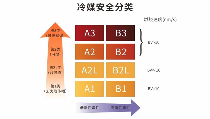 根據(jù)ASHRAE 34-2022標(biāo)準(zhǔn),冷媒按毒性可分為A類(低慢性毒性)、B類(高慢性毒性),按可燃性可分為第1類(無火焰?zhèn)鞑?、第2L類(弱可燃)、第2類(可燃)、第3類(可燃易爆)。A2L是低毒弱可燃性冷媒,常見的有R32、R454A、R454B、R454C、R1234ze、R1234yf等。A3冷媒是高可燃性天然工質(zhì),常見的有R290等。為應(yīng)對(duì)全球變暖問題,全球?qū)Ω逩WP冷媒的管控趨嚴(yán),A2L和A3冷媒因低GWP特性成為全球制冷行業(yè)綠色轉(zhuǎn)型的必然選擇。