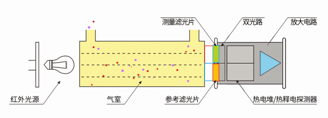 非分光紅外(NDIR)技術(shù)是利用氣體對(duì)特定波長紅外光的吸收特性來測量氣體濃度,檢測不同型號(hào)冷媒氣體只需選擇對(duì)應(yīng)的特征吸收波段,具有選擇性好,抗干擾能力強(qiáng),檢測精度高,壽命長,可靠性高等優(yōu)勢,但NDIR冷媒泄漏監(jiān)測傳感器因其相對(duì)復(fù)雜的設(shè)計(jì)使其尺寸在應(yīng)用中存在局限性。