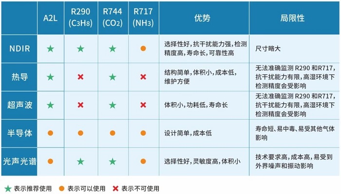 目前針對(duì)A2L/A3冷媒泄漏監(jiān)測的技術(shù)主要包括非分光紅外技術(shù)、熱導(dǎo)技術(shù)、超聲波技術(shù)、半導(dǎo)體技術(shù)和光聲光譜技術(shù)。
