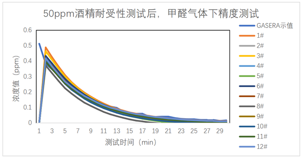 甲醛氣體背景濃度下開機(jī)后,酒精介入測(cè)試曲線圖