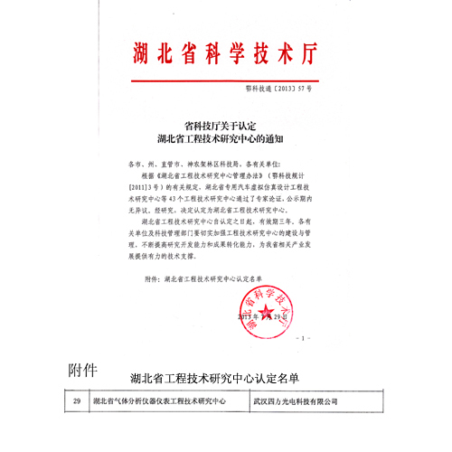 2013年7月29日,依托我公司技術(shù)中心建立的湖北省氣體分析儀器儀表工程技術(shù)研究中心通過專家論證,被湖北省科學(xué)技術(shù)廳認(rèn)定為湖北省工程技術(shù)研究中心。