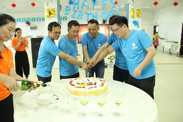 同舟共濟,感恩同行!觥籌交錯,舉杯暢飲!最后,公司總經理劉志強先生、董事長熊友輝博士及公司高層切蛋糕、開香檳,與全體員工舉杯共祝四方光電十五歲生日快樂!一片歡聲笑語中,四方光電十五周年慶典完美落幕!