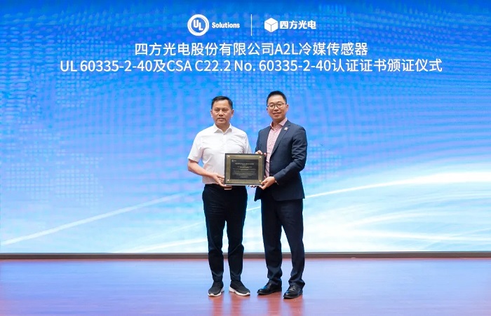 2024年6月14日,UL Solutions為四方光電股份有限公司頒發(fā)基于UL 60335-2-40標(biāo)準(zhǔn)的亞太地區(qū)首張新型環(huán)保冷媒泄漏監(jiān)測傳感器的認(rèn)證證書。授證儀式在四方光電技術(shù)中心報(bào)告廳舉行,UL Solutions建筑環(huán)境安全科技事業(yè)部全球總經(jīng)理 Karine Johnfroe、亞洲區(qū)總經(jīng)理許潔、四方光電董事長熊友輝博士等雙方代表20余人參加了本次活動(dòng)。