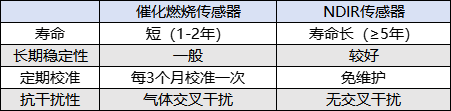 催化燃燒檢測(cè)是氣體接觸催化劑后引發(fā)無(wú)焰燃燒,燃燒加熱測(cè)溫絲,通過(guò)檢測(cè)測(cè)溫絲的電阻值變化,計(jì)算氣體濃度,原理決定了其壽命短、長(zhǎng)期穩(wěn)定性差等問(wèn)題。