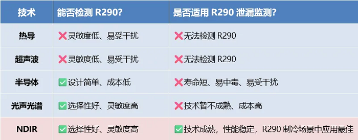 其中,熱導(dǎo)和超聲波技術(shù)因其測(cè)量的廣譜性易受到干擾氣體的影響導(dǎo)致傳感器誤報(bào),且對(duì)R290氣體在燃燒/爆炸下限范圍的測(cè)量靈敏度低使其無法準(zhǔn)確監(jiān)測(cè)R290。半導(dǎo)體技術(shù)雖成本低,但存在壽命短、易中毒、易受干擾等問題,穩(wěn)定性和可靠性有限。